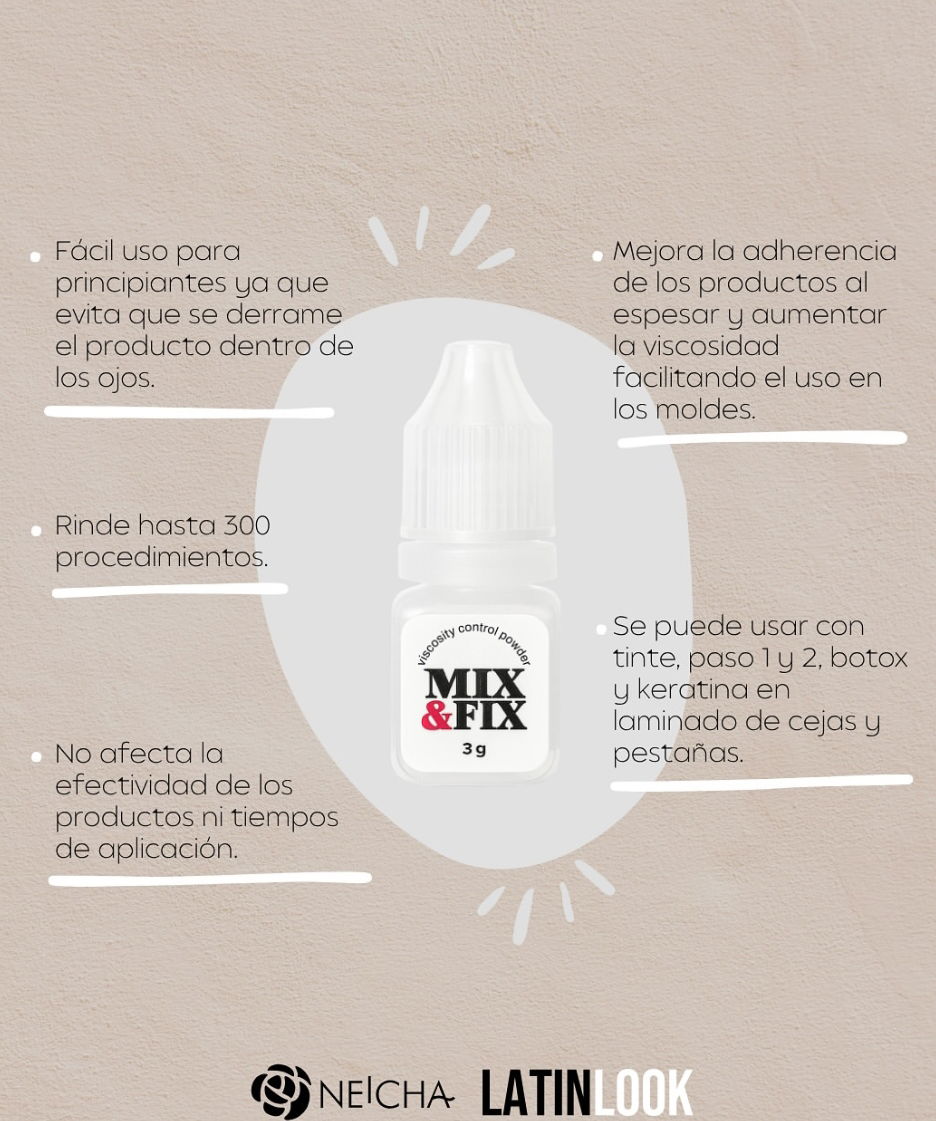 Mix & Fix es un polvo innovador que espesa y ajusta la viscosidad de productos lÃquidos como tintes, pasos 1 y 2, botox o keratina. Mejora la adherencia al molde, facilita la aplicación y evita derrames indeseados.